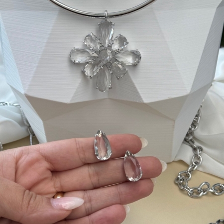 • Choker Rígida com Pingente e Brincos de Cristal Transparente