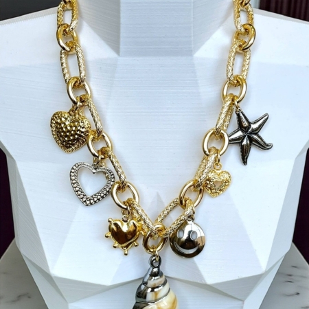 • Colar Corrente Dourada com Pingentes Marítimos & Coração Prata