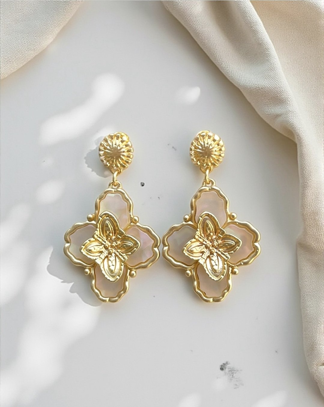 - Fundo Iridescente: As pétalas são preenchidas com uma peça de Madrepérola ou Resina Esmaltada em um tom suave, que reflete a luz com um efeito iridescente (furta-cor). Este toque perolado confere uma luz suave e sofisticada ao brinco.