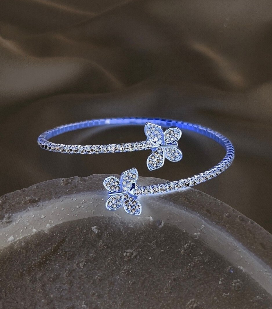 ✨ Imagine a delicadeza transformada em joia: um bracelete fininho, com a leve maleabilidade de uma mola que se ajusta com suavidade ao pulso. Em cada extremidade, duas borboletas delicadas ganham vida, inteiramente cravejadas em zircônias que brilham em harmonia com todo o bracelete, também coberto de pedrarias cintilantes. 🦋✨