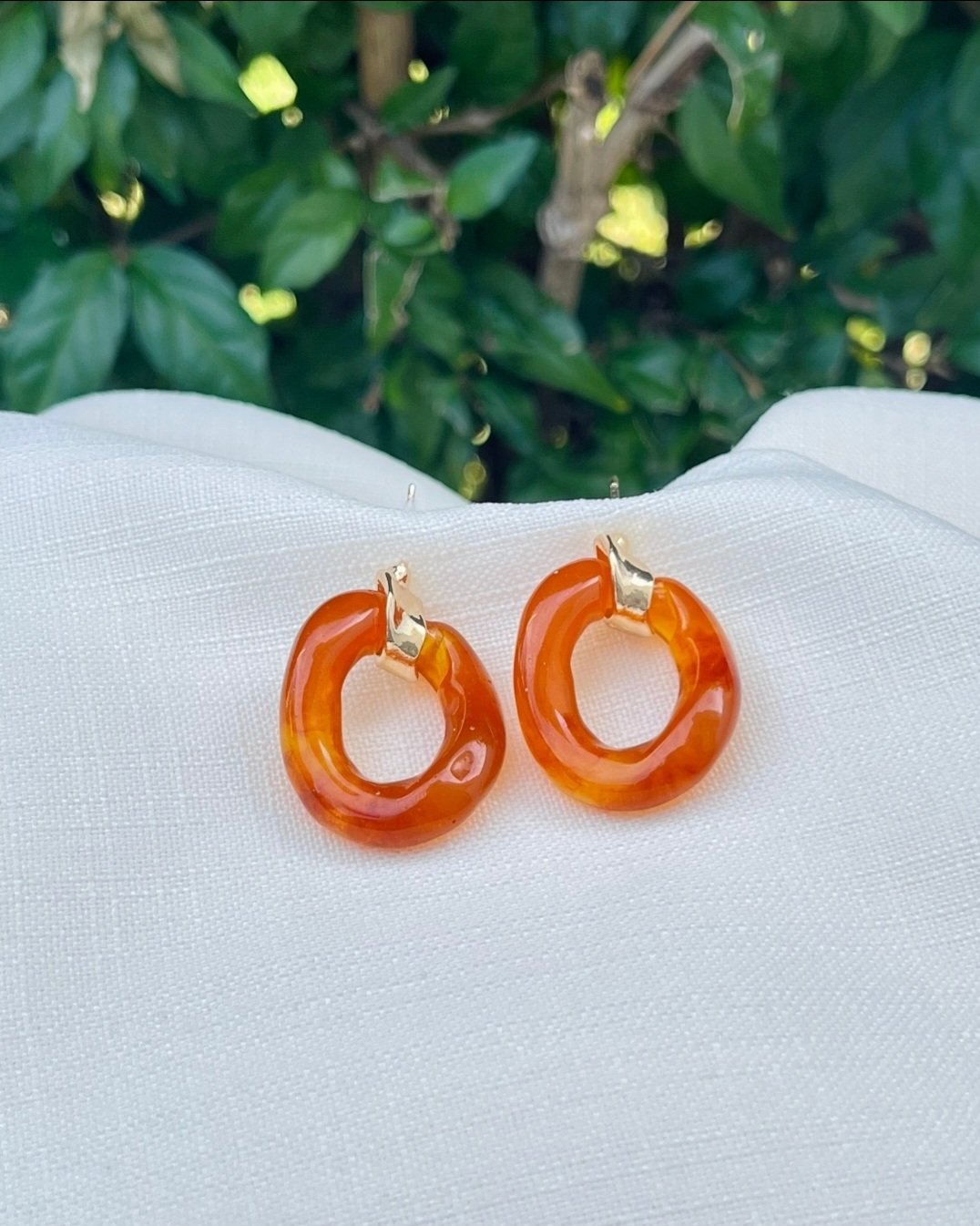Com design orgânico e moderno, este brinco em resina âmbar caramelado reflete sofisticação com um toque natural. O fecho em dourado completa a peça com elegância, tornando-a perfeita para quem busca estilo e originalidade em um só acessório.