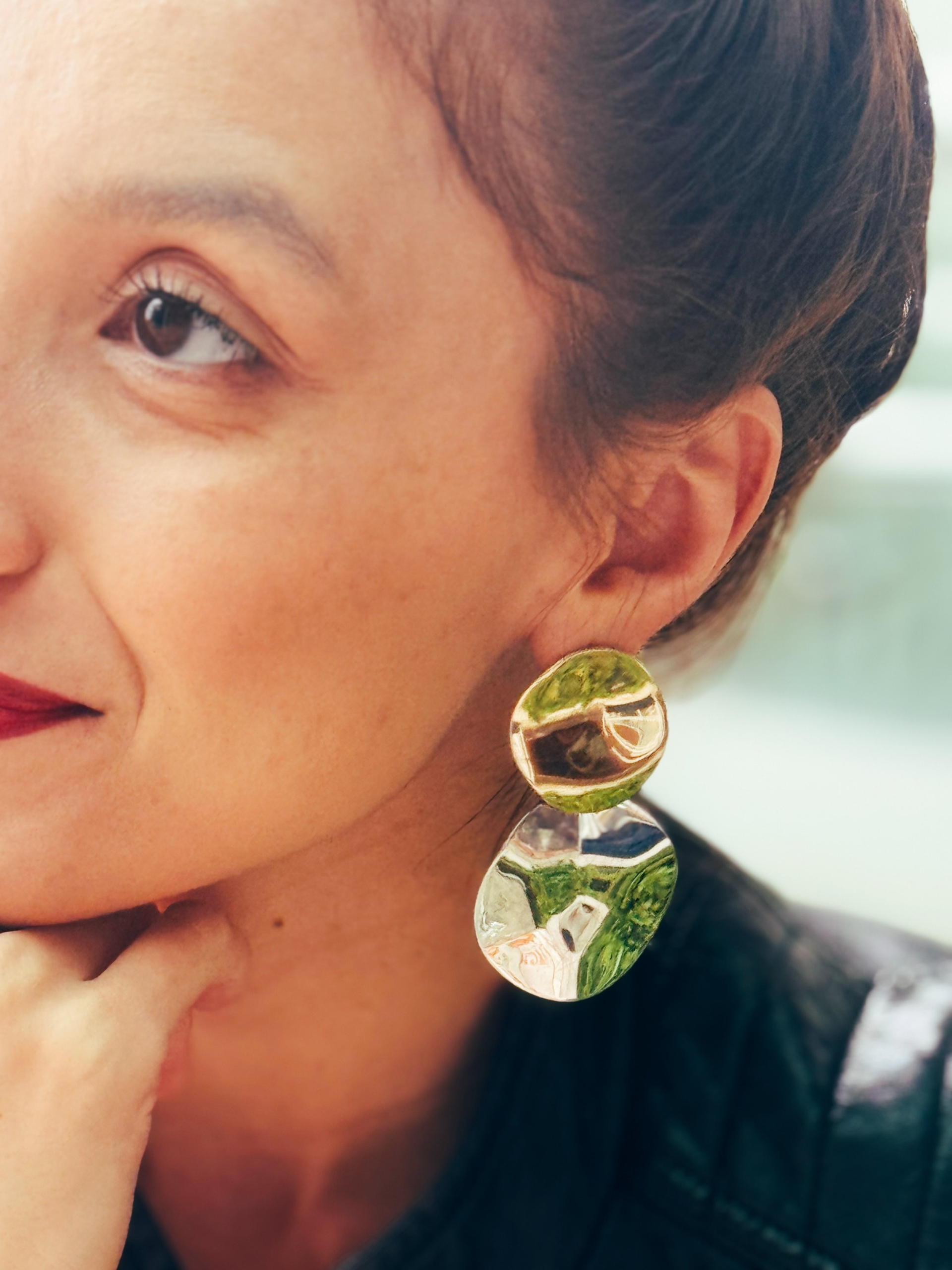 Este par de brincos combina o brilho do metal prateado e dourado em um formato elegante e moderno. A parte superior é um círculo com acabamento liso e espelhado na cor prata, enquanto a parte inferior, em dourado, possui uma forma irregular e textura martelada que reflete a luz de maneira fascinante. A combinação de cores e texturas cria um contraste interessante, perfeito para quem busca uma peça de destaque para o look.