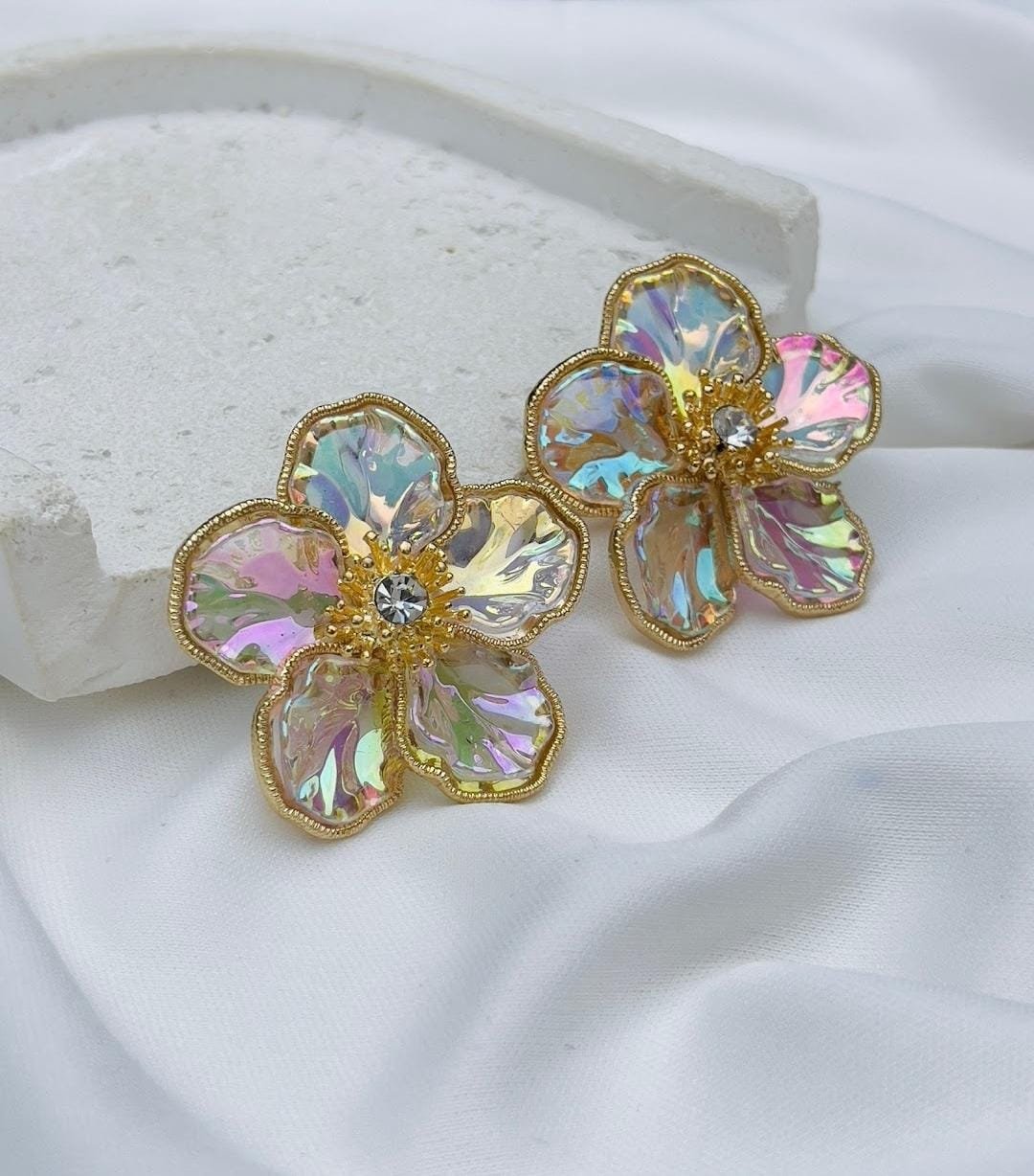 Cada brinco é uma flor delicada e moderna, com um design que irradia um brilho iridescente, refletindo uma paleta de cores que muda a cada movimento. É como ter um pedaço do arco-íris em suas orelhas. O contorno dourado e a pequena pedra de zircônia no centro adicionam um toque extra de glamour e sofisticação.
