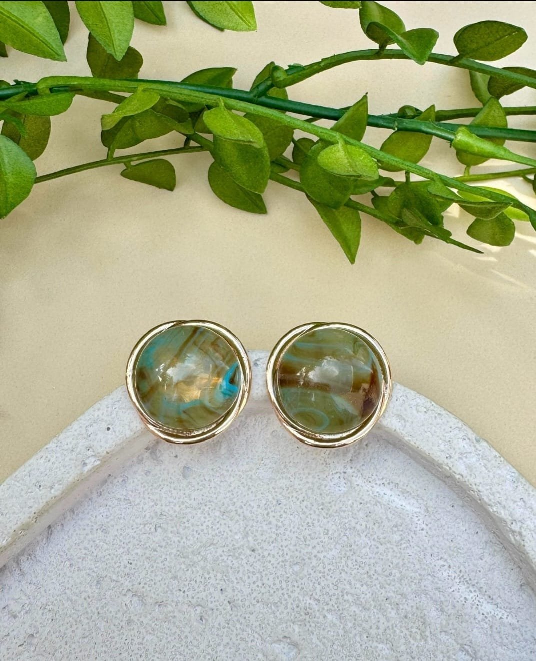 Deixe-se levar pela beleza natural do nosso Brinco Maré Viva, uma joia que captura a essência da natureza com um toque de elegância. Este brinco deslumbrante apresenta uma resina marmorizada em tons de verde esmeralda, azul turquesa e nuances terrosas, harmoniosamente envolta por uma moldura dourada e brilhante.