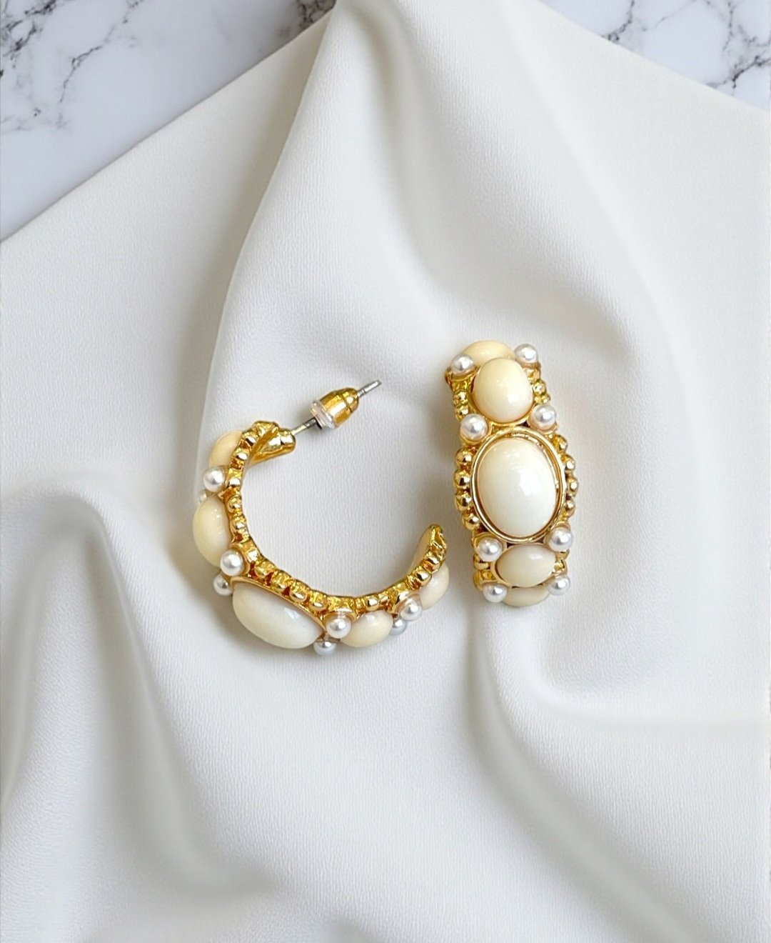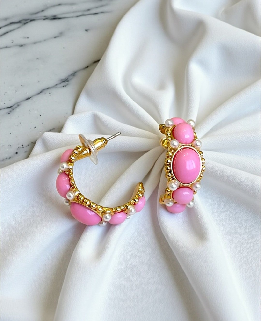 A argola robusta, com seu acabamento texturizado em banho dourado de alta qualidade, serve de base para uma composição deslumbrante. O grande diferencial está na aplicação de gotas em resina de cores vibrantes, dispostas de forma harmônica, e de mini pérolas delicadas que preenchem os espaços e adicionam um brilho sutil e feminino.