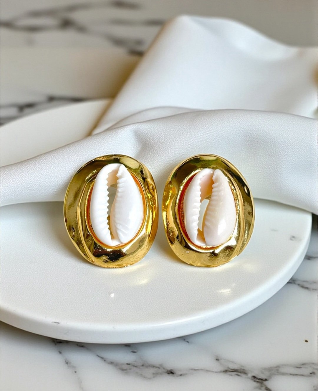 Adicione um toque de encanto natural e estilo boho-chic ao seu look com nossos brincos de búzios. Estes brincos de pino apresentam uma verdadeira concha de búzio no centro, emoldurada por um aro dourado com acabamento polido e irregular, que adiciona um toque de modernidade e elegância.