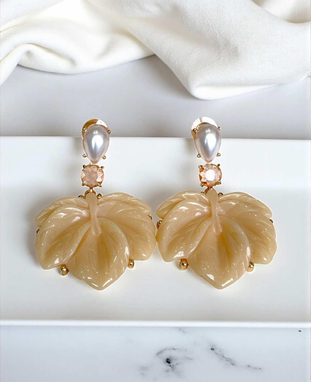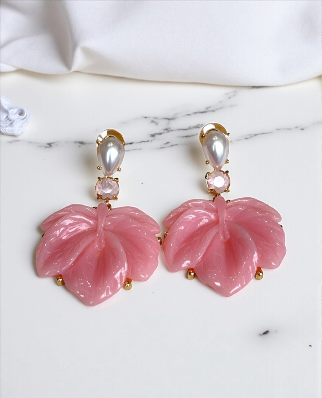 Ambos os modelos são ricamente adornados na parte superior com uma pérola em formato de gota e um cristal facetado que capta a luz, elevando ainda mais o design. Pequenos detalhes dourados pontuam a base da folha, adicionando um brilho extra.