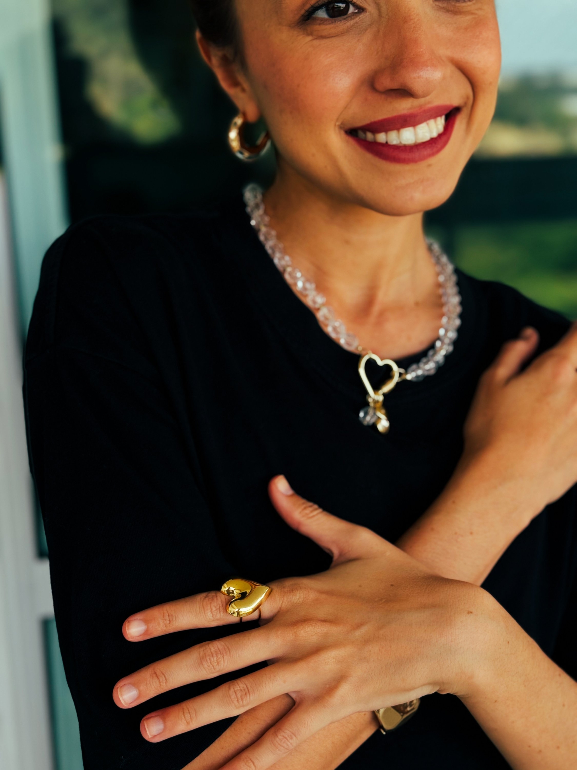 O Colar com Contas Transparentes é uma peça encantadora que une a leveza do cristal ao charme do fecho dourado em formato de coração. Os pingentinhos delicados, como gotas e cristais, completam o visual com movimento e sofisticação. Um acessório versátil para todas as ocasiões.
