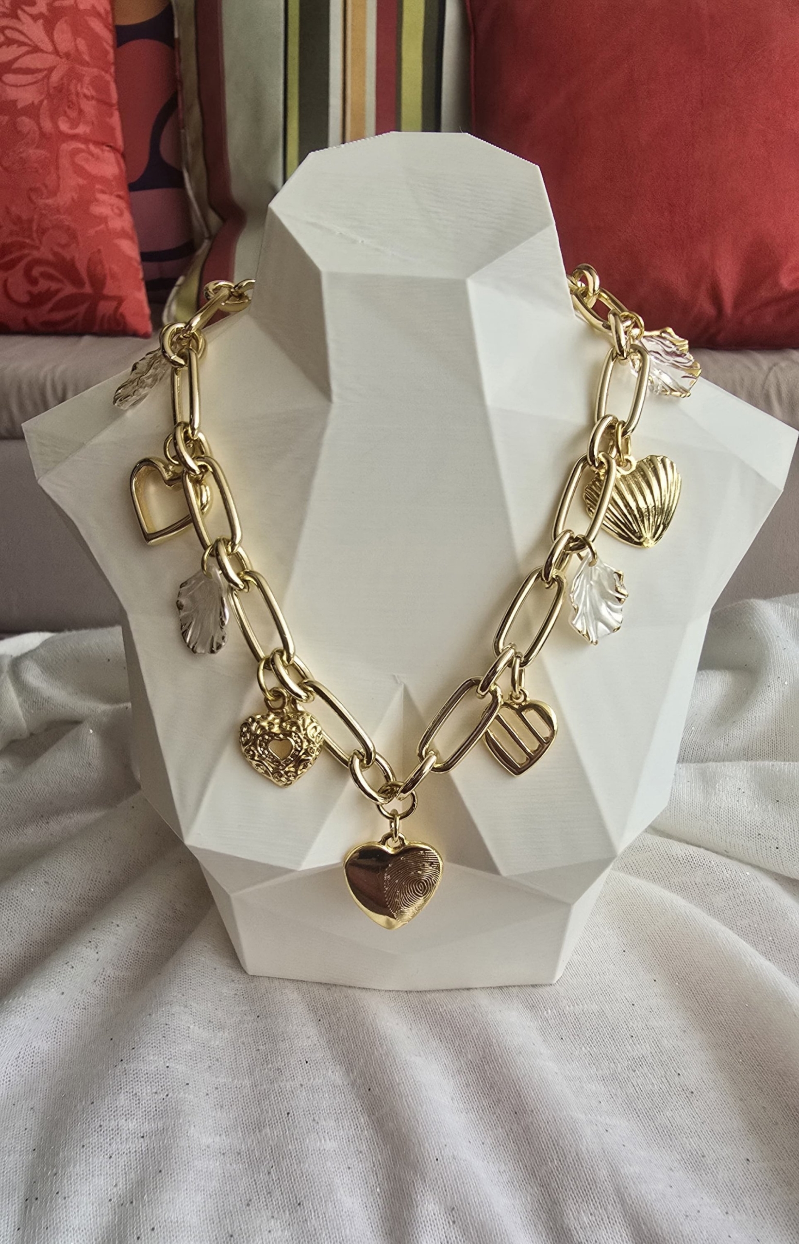 O que o torna ainda mais especial é a variedade de pingentes pendurados que contam uma história de amor e mistério. Você encontrará corações de diferentes estilos, de um design liso e moderno a um com detalhes intrincados, e outros em acrílico translúcido para um toque de leveza. A concha dourada traz a beleza do mar, adicionando uma vibração mística.