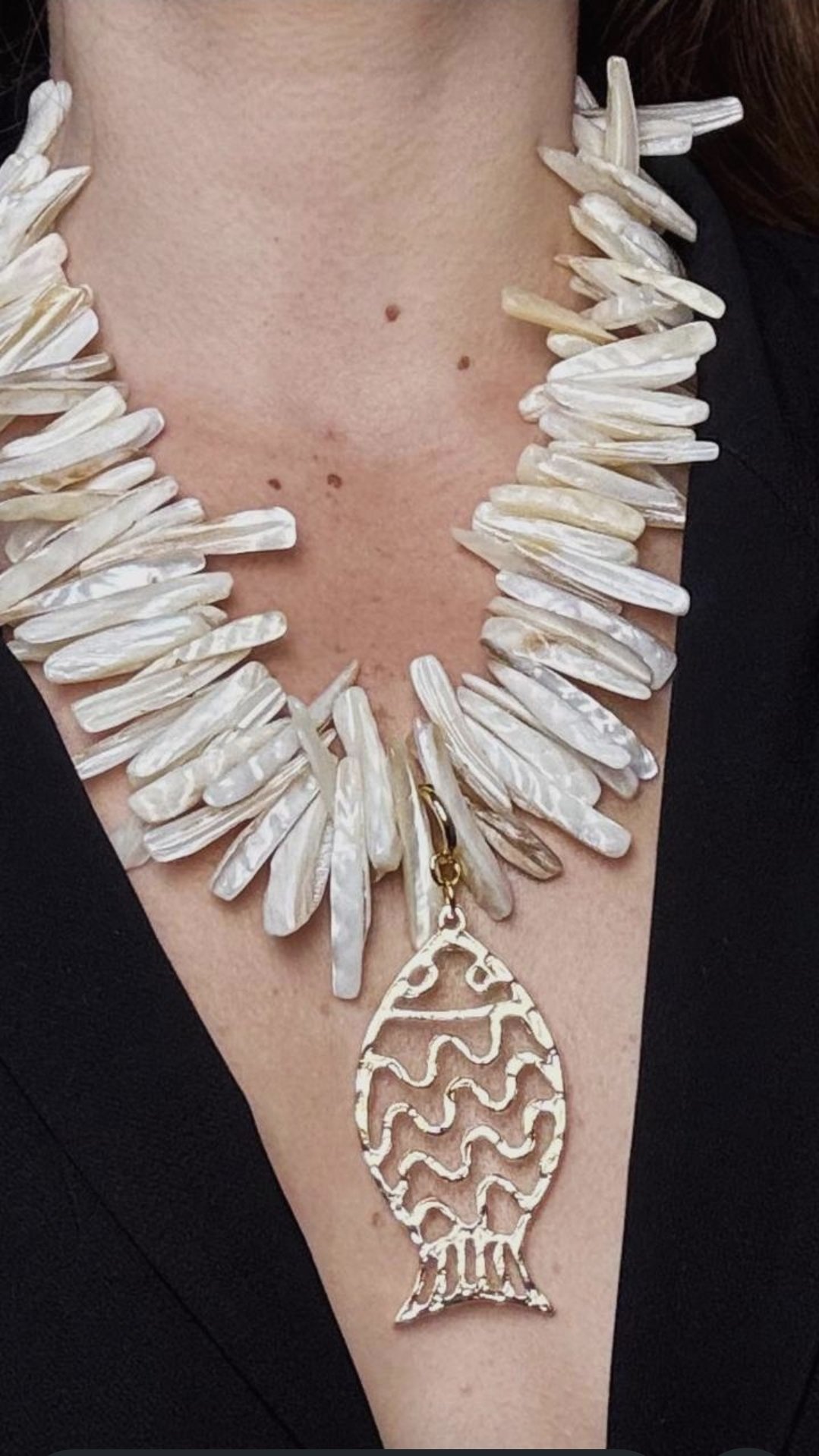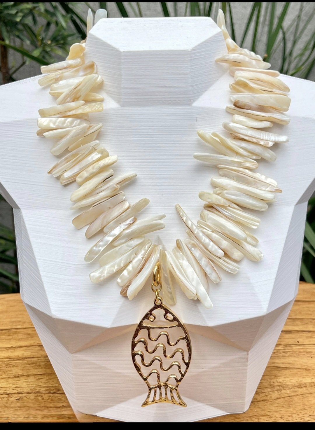 Com pedras irregulares de madrepérola que refletem a luz com elegância e um pingente de peixe em banho de ouro, este colar traduz o encanto do mar em uma peça sofisticada e cheia de estilo.