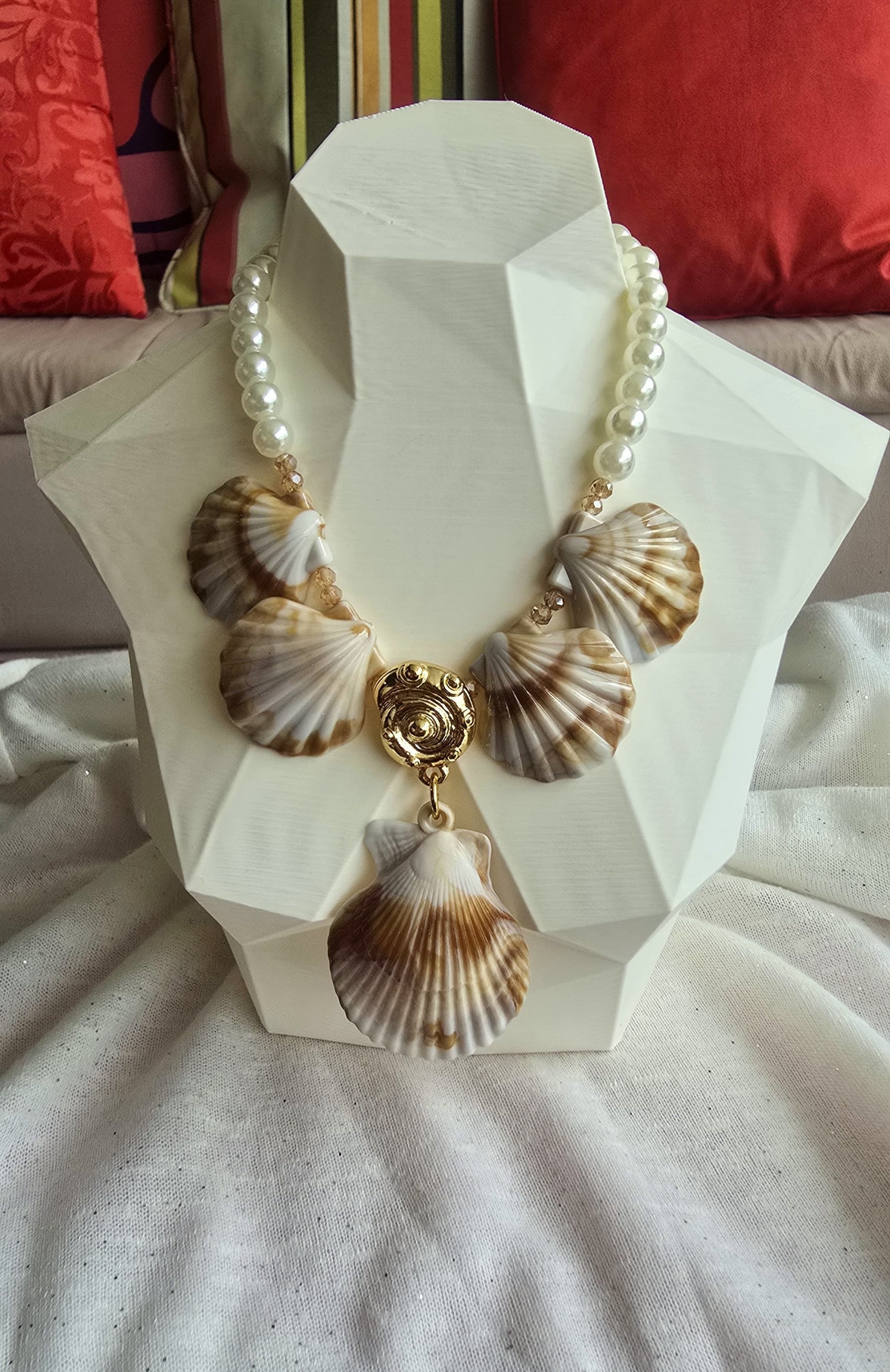 O grande diferencial são os pingentes de concha que se espalham de forma orgânica pela peça, trazendo a leveza e a energia da praia. É um acessório versátil que combina a pureza das pérolas com a ousadia dos elementos naturais, perfeito para ser usado na beira da praia, na piscina ou para dar um toque de verão a um look urbano.