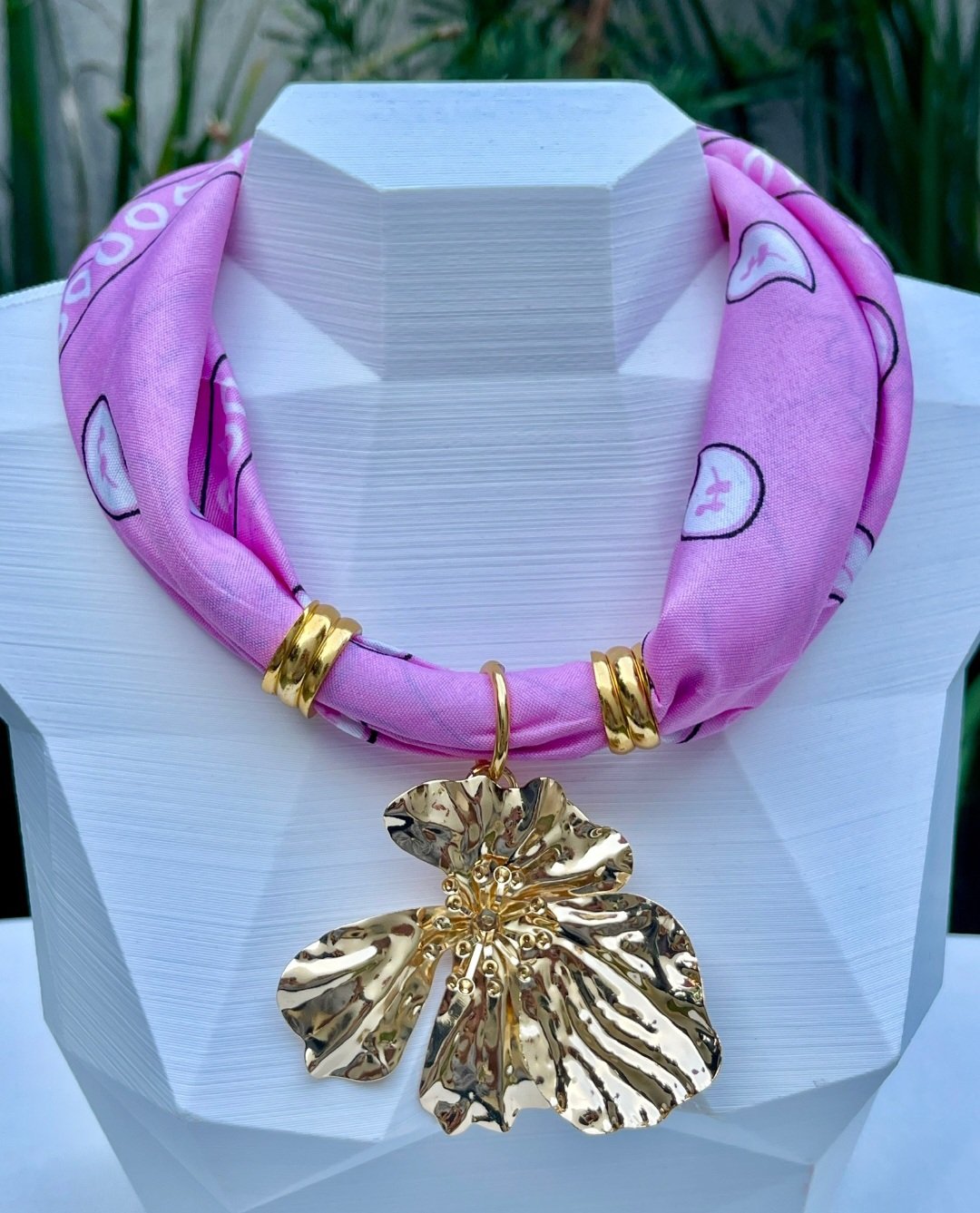 O colar apresenta uma bandana de tecido que adiciona um toque urbano e moderno, ideal para criar um visual único e personalizado. Acessórios em banho dourado de alta qualidade prendem a bandana, dando um acabamento elegante e um brilho especial à peça.