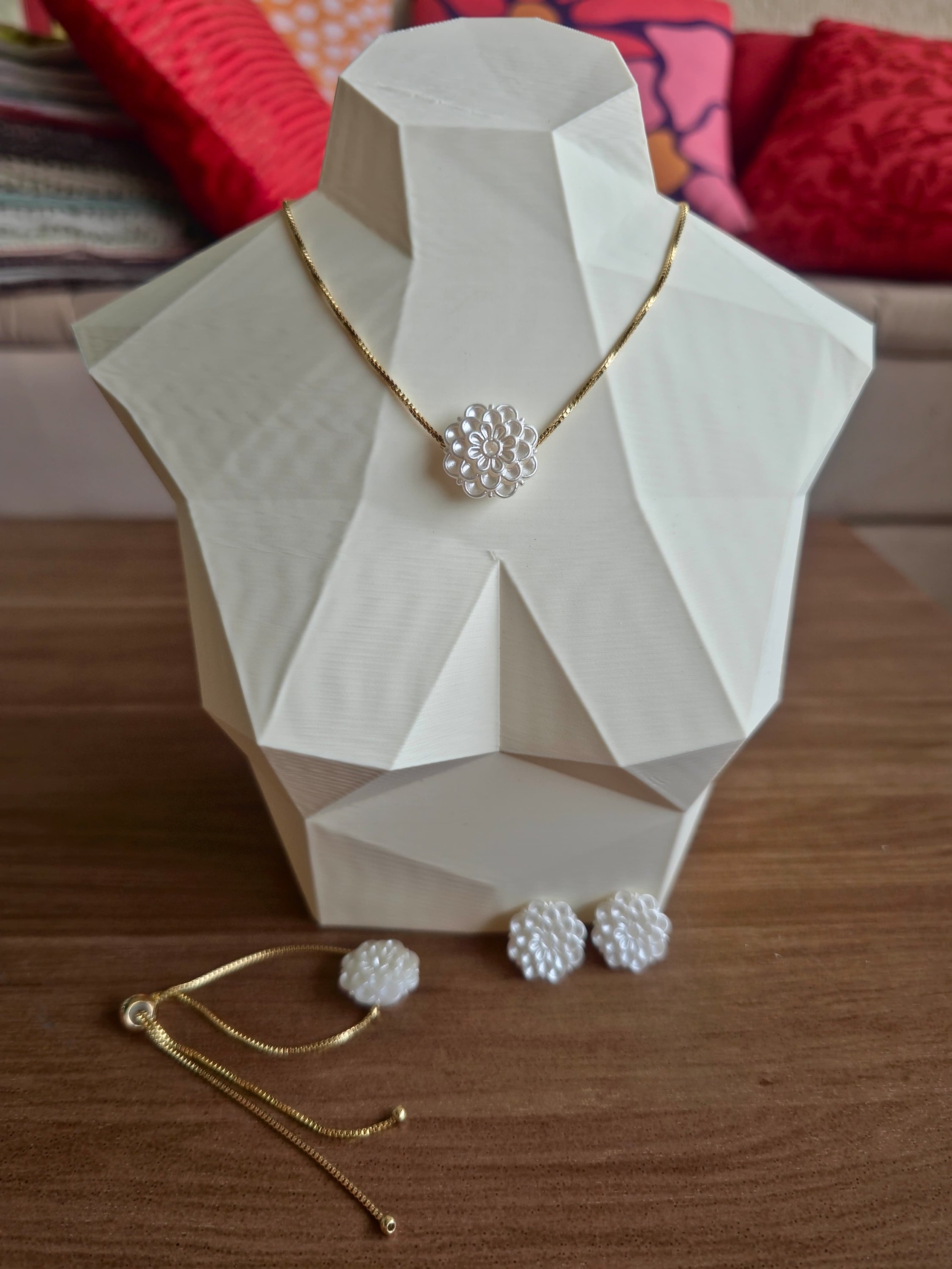 O grande destaque é a flor em formato de mandala, meticulosamente feita com pequenas pérolas brancas que criam um design floral sofisticado e texturizado. A corrente possui um brilho dourado sutil, complementando a pureza das pérolas.