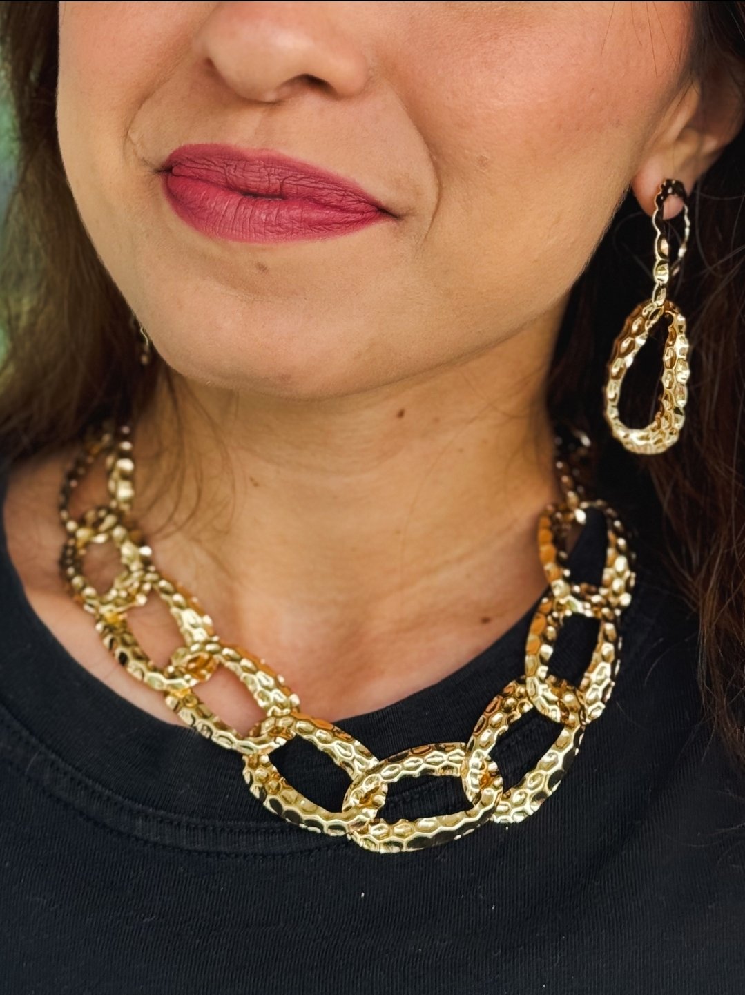 Este conjunto robusto é composto por um colar com elos grandes e texturizados com um efeito martelado, que cria um brilho único e uma sensação de movimento. Para complementar, os brincos seguem o mesmo design arrojado, garantindo um look harmonioso e impactante.