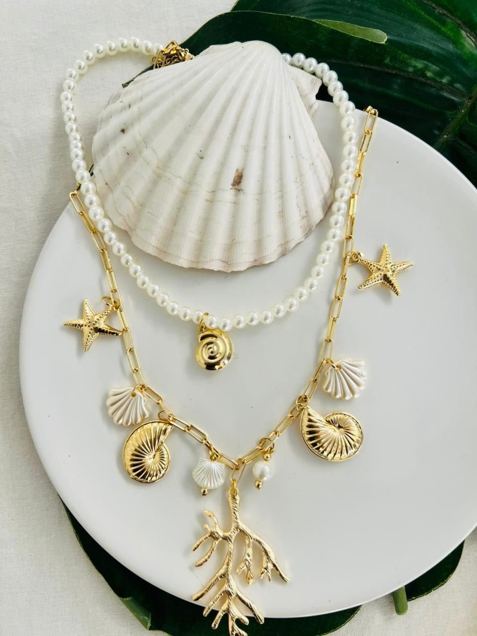 - Camada Superior (mais justa ao pescoço): Um fio de pérolas pequenas (provavelmente imitações de pérolas) com um único pequeno pingente de concha em espiral na cor dourada no centro.