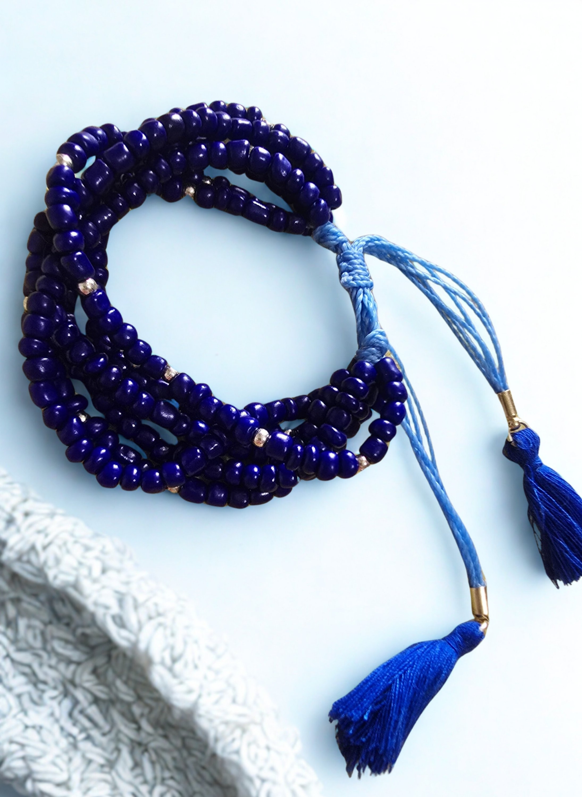Miçangas azuis com pontos dourados que trazem brilho na medida certa.