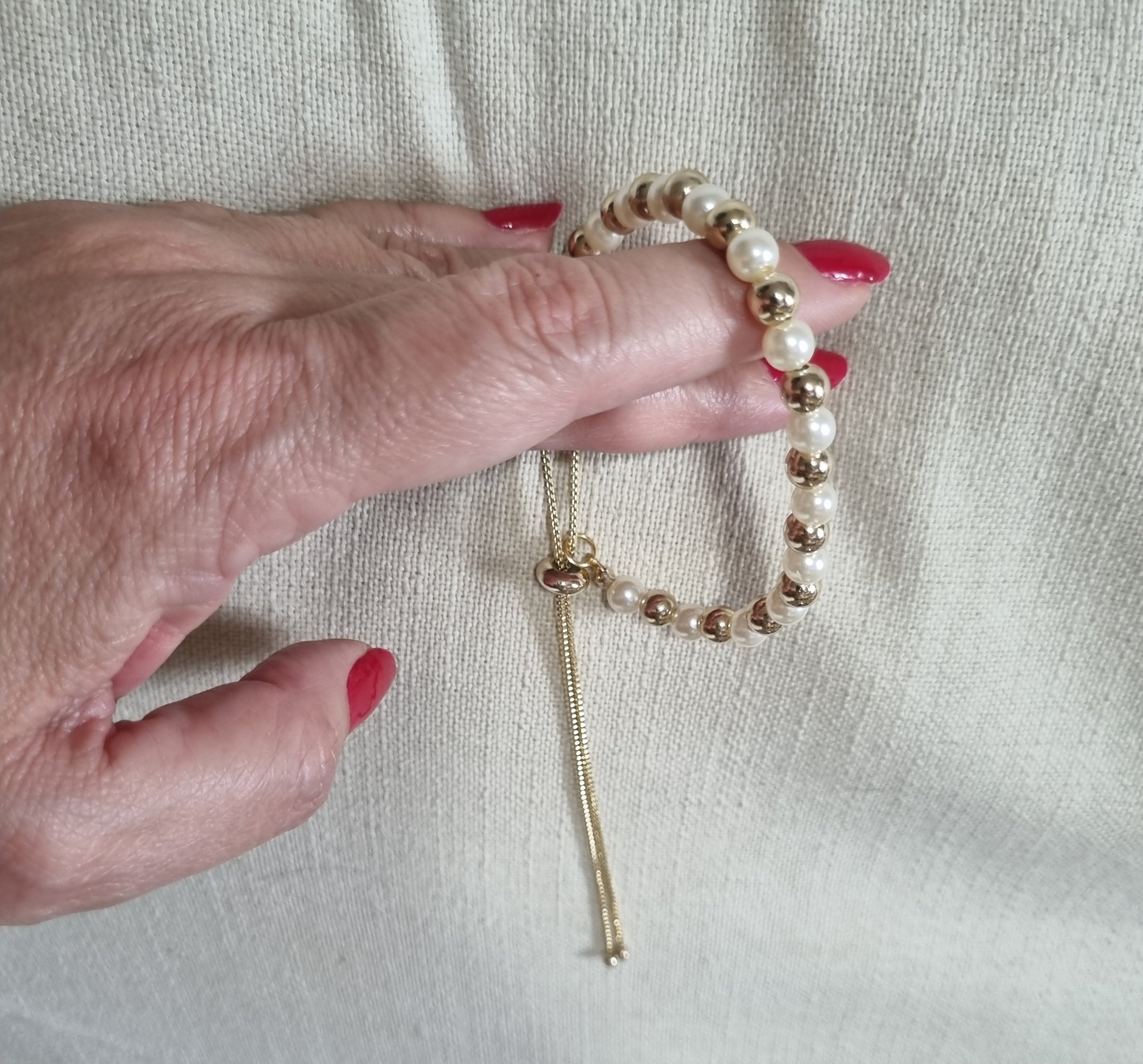 Esta pulseira é a combinação perfeita entre o clássico e o moderno. Seu design apresenta uma delicada fileira de pérolas brancas intercaladas com bolinhas douradas folheadas, criando um contraste elegante e sofisticado.